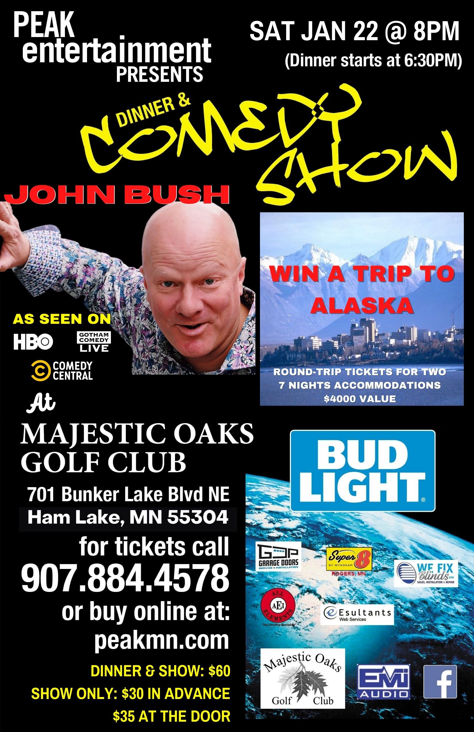 Join us for a night of comedy at Majestic Oaks Golf Club with Peak Entertainment. Dinner and comedy show with John Bush. Dinner and show - $60. Show only - $30 in advance and $35 at the door. Dinner starts at 630pm and show at 8pm. Call 907-884-4578 for tickets.